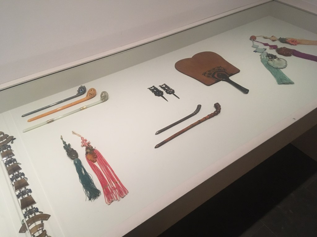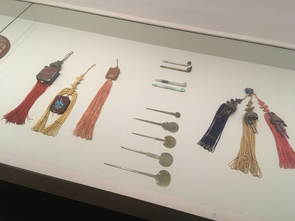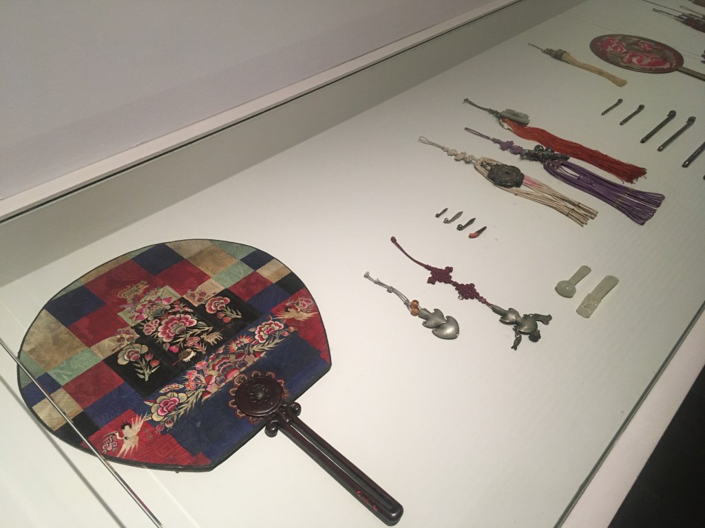 Norigae – 노리개 in embroidered and applied silk fabrics, silver, enamel, jade, amber, coral, horsehair. Binyeo – 비녀 hair pins and ornaments in partially gilded silver, enamel, jade, amber, coral, pearl, bamboo, ox horn. Wood, bamboo, metal, paper and embroidered silk fans.