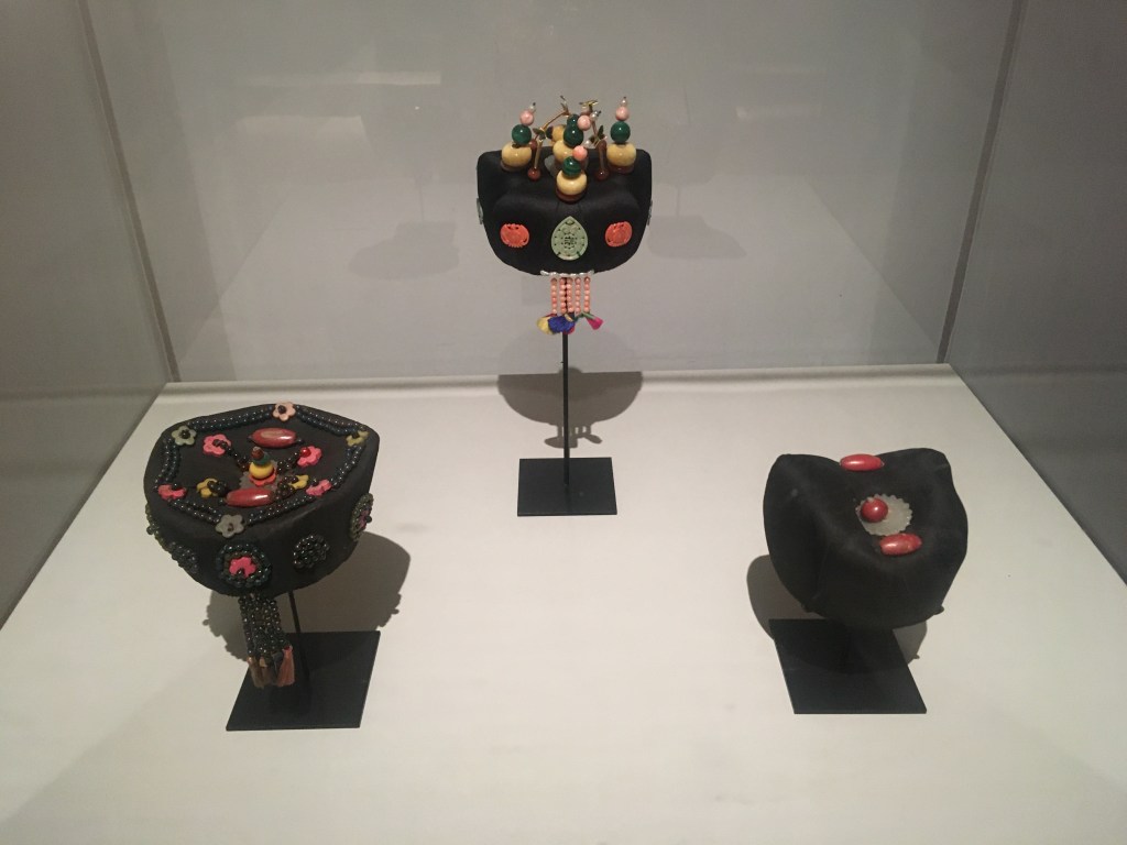 Jokduri – 족두리 in silk on cardboard frame, metal wire, enameled metal ornaments, stones and faux pearls