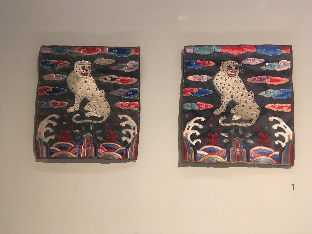 The badge Hyungbae – 흉배 embroidered on the dress of officials of the Joseon dynasty from the 15th century onwards are borrowed from the official clothing of Ming China (1398-1644). One could represent there a crane or a hybrid being half-tiger half-leopard called Hopyo – 호표 and was used to recognize the rank of the officials.