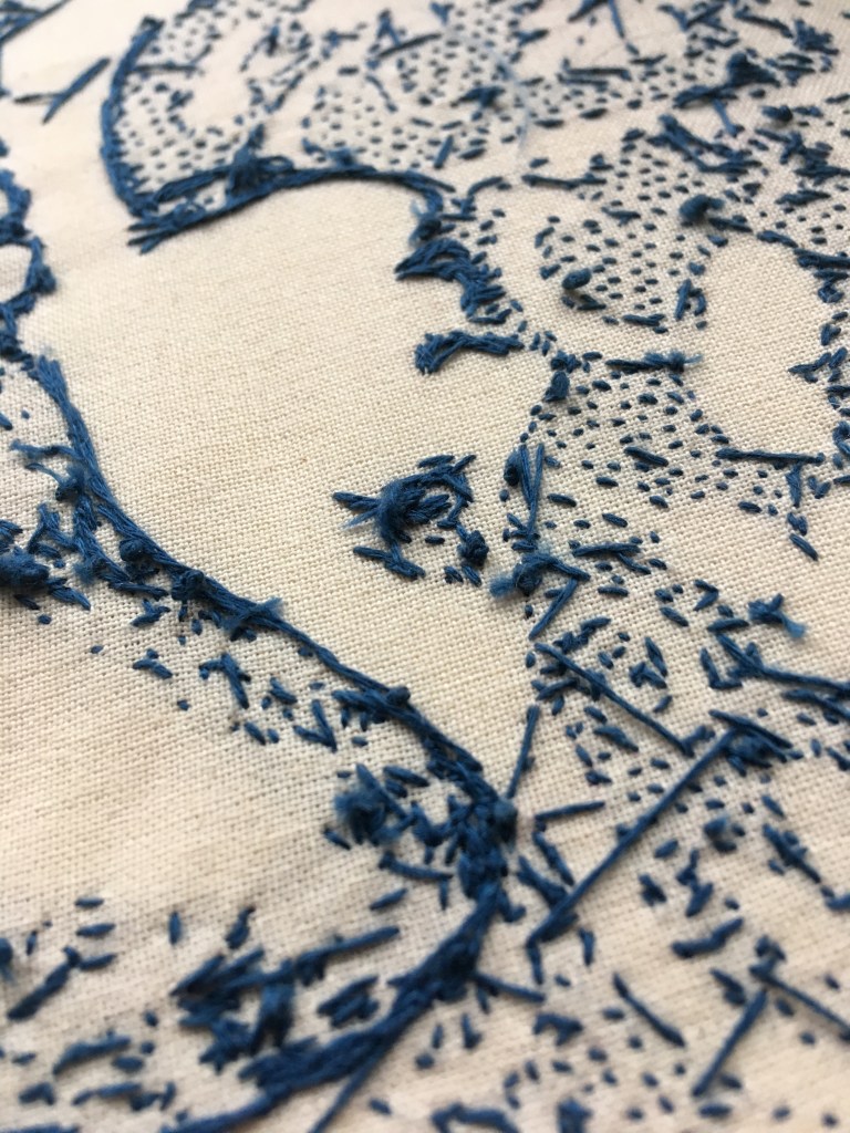 I don’t need a lot of material (a hoop, my blue indigo yarns, my magic pen to draw, a needle, my thimble, my scissors and cloth boss).